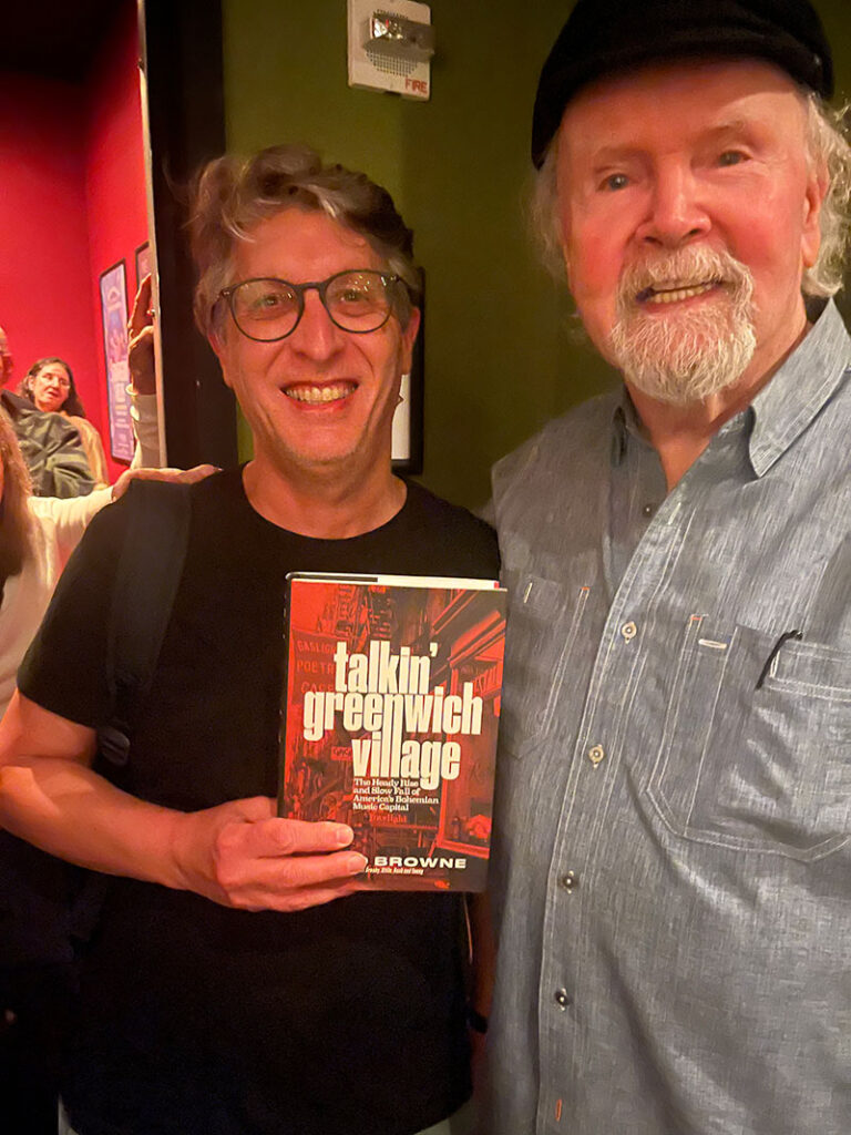 “It felt like a scene that needed to be chronicled, since there hadn’t been a narrative history of it, which somewhat shocked me,” says Browne, who decided in 2020 to write Talkin’ Greenwich Village: The Heady Rise and Slow Fall of America’s Bohemian Music Capital. “Most of the clubs were gone, many of the veterans of the scene had passed away or were winding down, and it just felt right. I had no idea, when I began, that Timothee Chalamet would be portraying Dylan in a movie about that scene a few years later!”